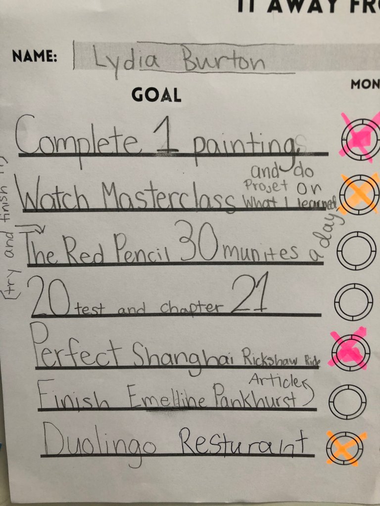 Some of these topics include ones we have agreed upon together, and some are purely the interests of that particular child. We try to make these goals as specific as possible. Instead of just doing some “maths” for the week, they write down exactly what they hope to accomplish in their maths study. Instead of doing “photography” they will decide on a specific skill that they want to work on (usually based on a class or video they have seen) and they note the platform they will use in order to achieve that goal.