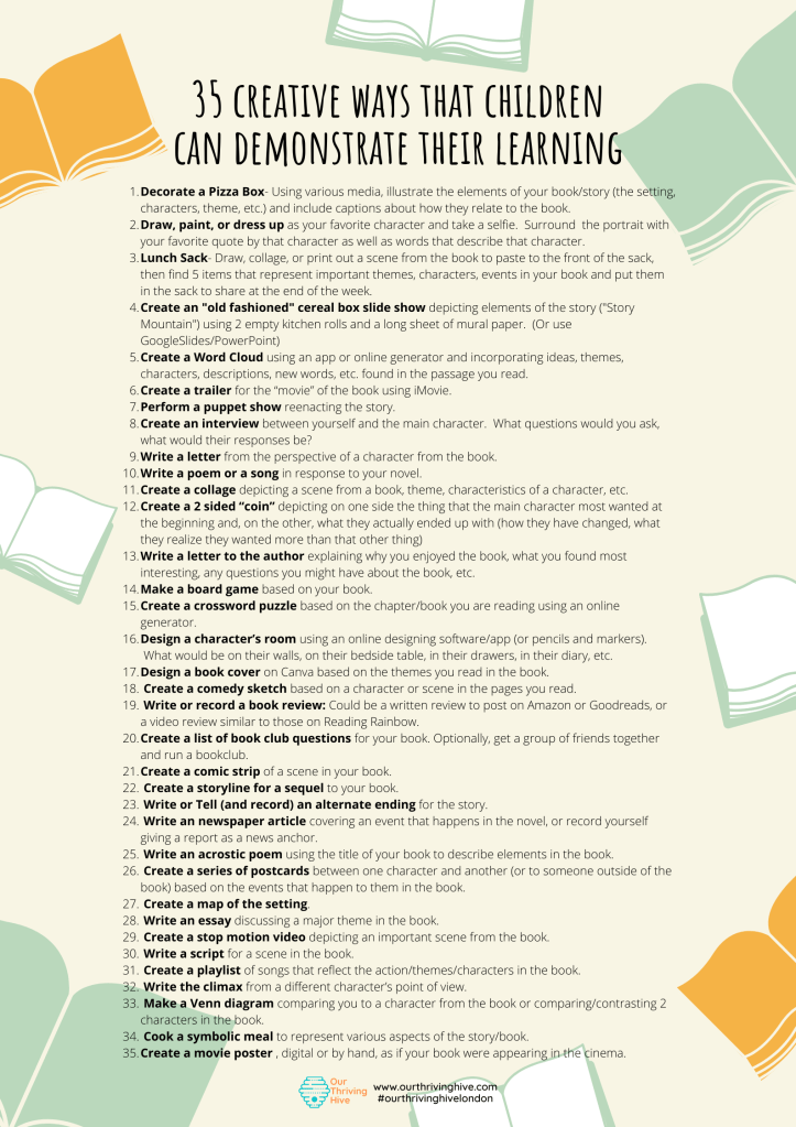 Note that many of the ways to demonstrate learning which involve writing can be adapted to include drawings, digital formats, or video/audio recordings for those children who would rather not show their learning in written form.