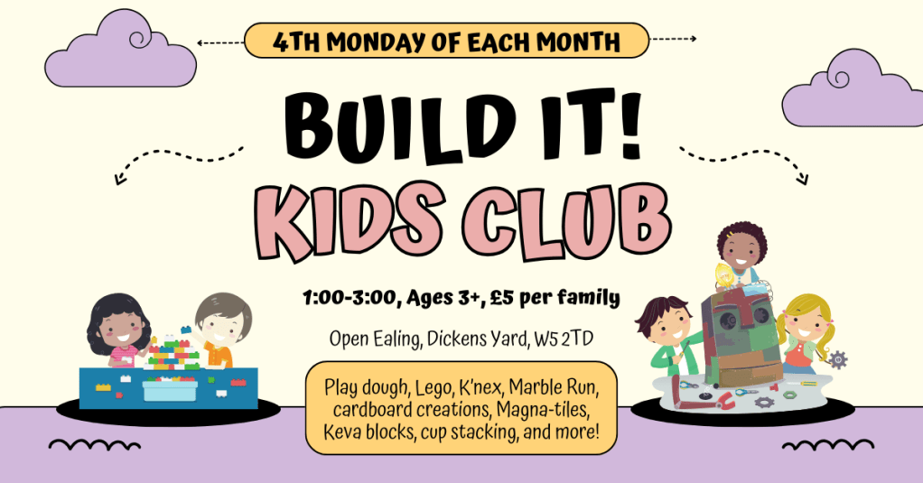 Kids: Built it! Club, ages 3+, Parents must accompany their children. Kids will use materials such as: playdough, cardboard, magna tiles, Lego, Keva blocks, paper sculptures, K’nex, marble runs, and more for some free-play building fun! £5 per family.