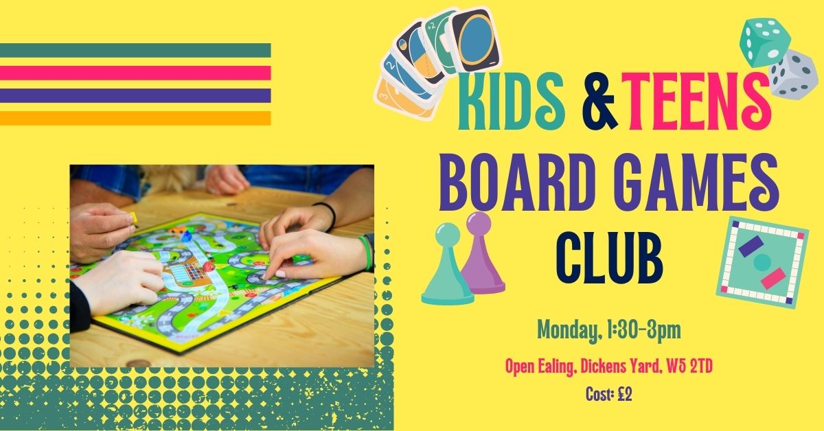 Board Games Club (Kids and Teens)-, ages 5+. Bring your own board game to share with others, learn a new game that someone else has brought, or design your own board game with materials provided. Teens can come on their own, but all other children must be accompanied by their parents. Cost: £2 per family.